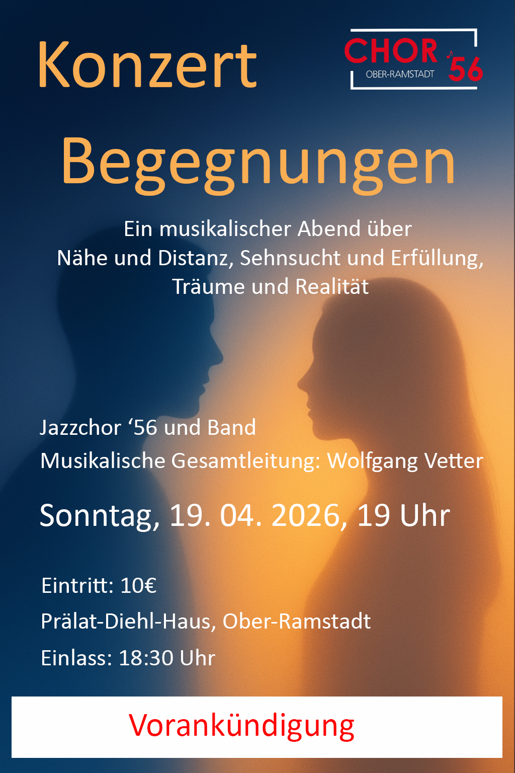 Unter dem Titel „Begegnungen“ veranstaltet der Jazzchor ’56 am 19. April 2026 im Prälat-Diehl-Haus einen Konzertabend, der Lieder und Texte zu einem stimmungsvollen Gesamterlebnis verbindet.
