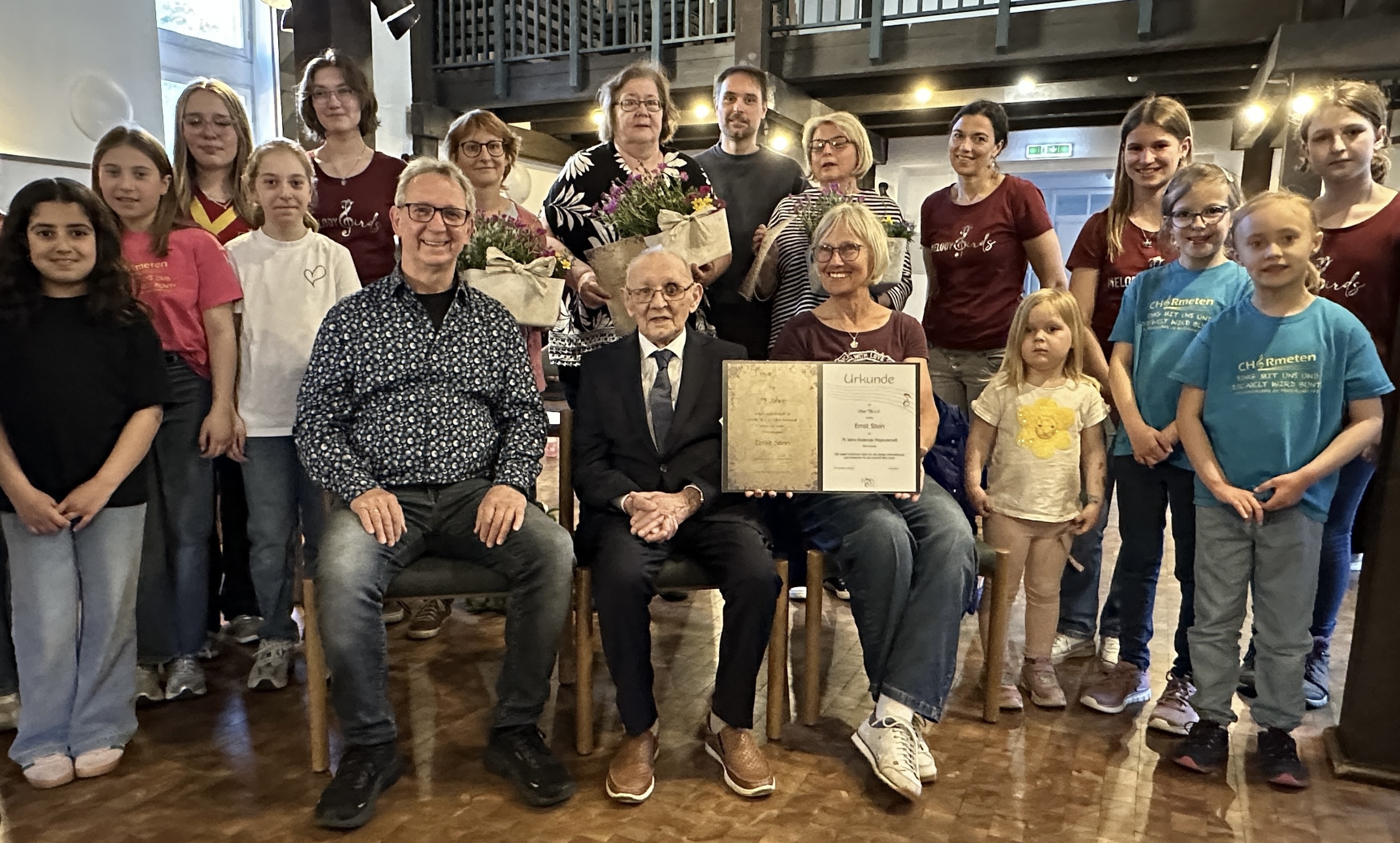 Im Rahmen der diesjährigen Mitgliederversammlung des Chor ´56 am 28.4.2025 standen neben den Wahlen des Vorstands und den Berichten aus dem Vereinsleben vor allem die Ehrungen langjähriger Mitglieder im Mittelpunkt. Besonders bewegt zeigten sich die Mitglieder des Chors bei der Auszeichnung für Ernst Stein, der für 75 Jahre Vereinszugehörigkeit gewürdigt wurde – eine außergewöhnliche Lebensleistung im Zeichen des Chorgesangs. 60 Jahre hat er nicht nur im Verein gesungen, sondern war auch im Vorstand aktiv. Für sein langjähriges Engagement wurde er zum Ehrenmitglied ernannt.