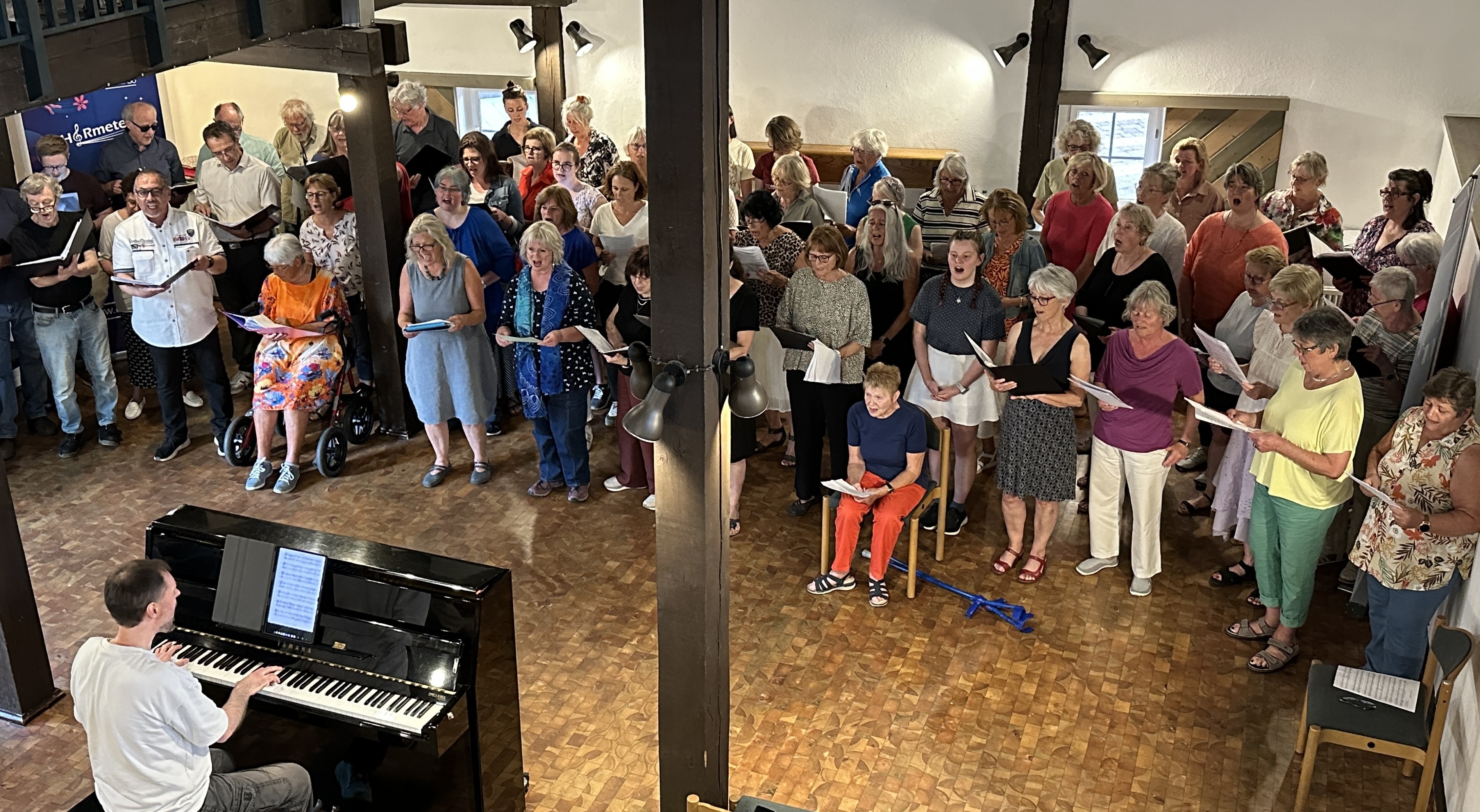 Montag abends ist die Probenzeit des Chor ´56 im Ober-Ramstädter Scheunensaal. Doch am 23.06.2025 gab es eine Probe der besonderen Art, denn der Chor lud zu einem „Wohnzimmerkonzert“ drei weitere Chöre ein: die Chorgemeinschaft Traisa, den Auerbacher Projektchor und QuerBEAT aus Darmstadt. Alle vier Chöre stehen unter der Leitung von Wolfgang Vetter, der die Idee zu diesem musikalischen Austausch hatte. Über 80 Sänger und Sängerinnen und eine große Zahl an Gästen kamen zusammen, um die Freude am Gesang zu feiern.