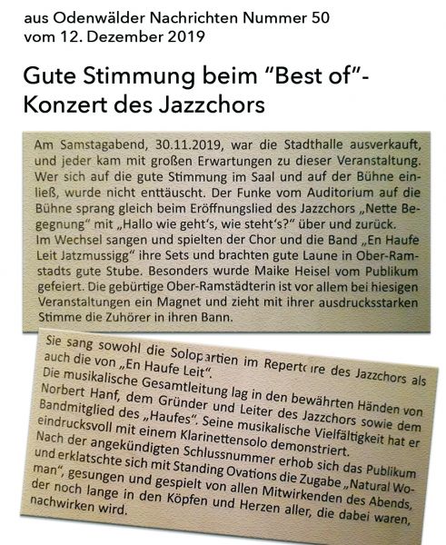 Klarinettensolo Norbert Hanf mit Jazzchor DSC08940 m Presse 12.2019 Solistin Maike Heisel mit En Haufe Leit beim Best Of Konzert des Jazzchors am 30.11.219 DSC08906 m