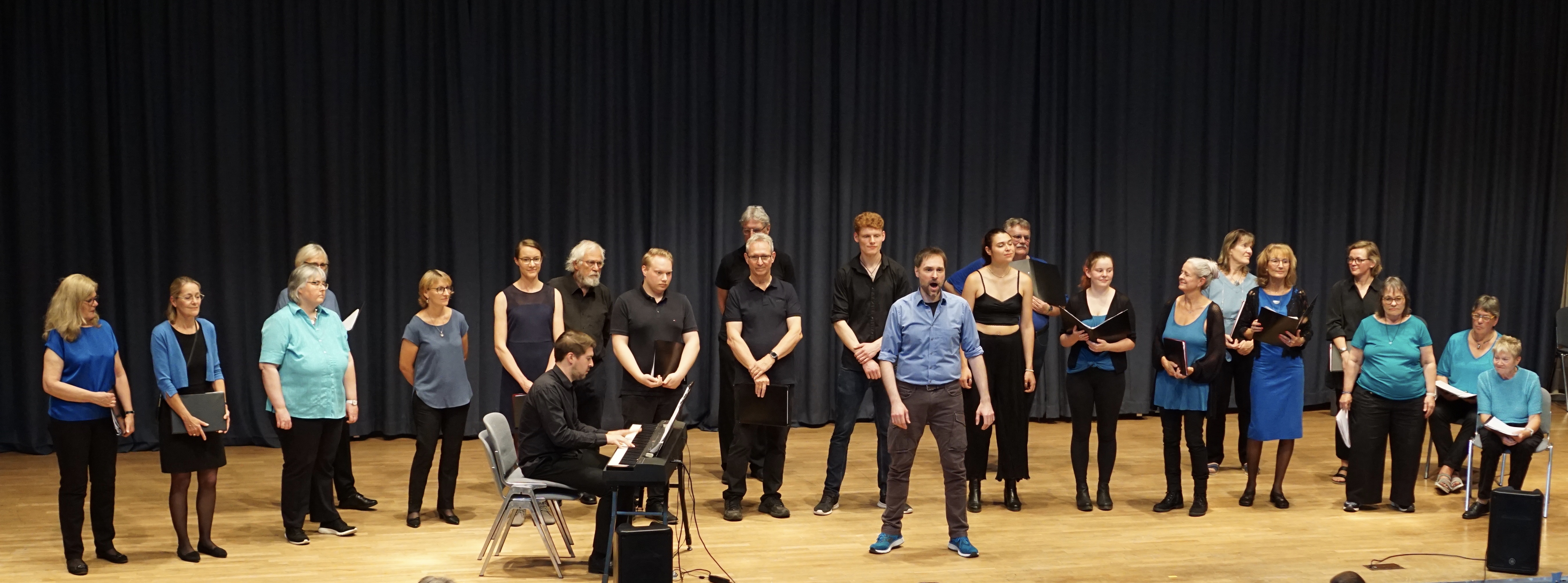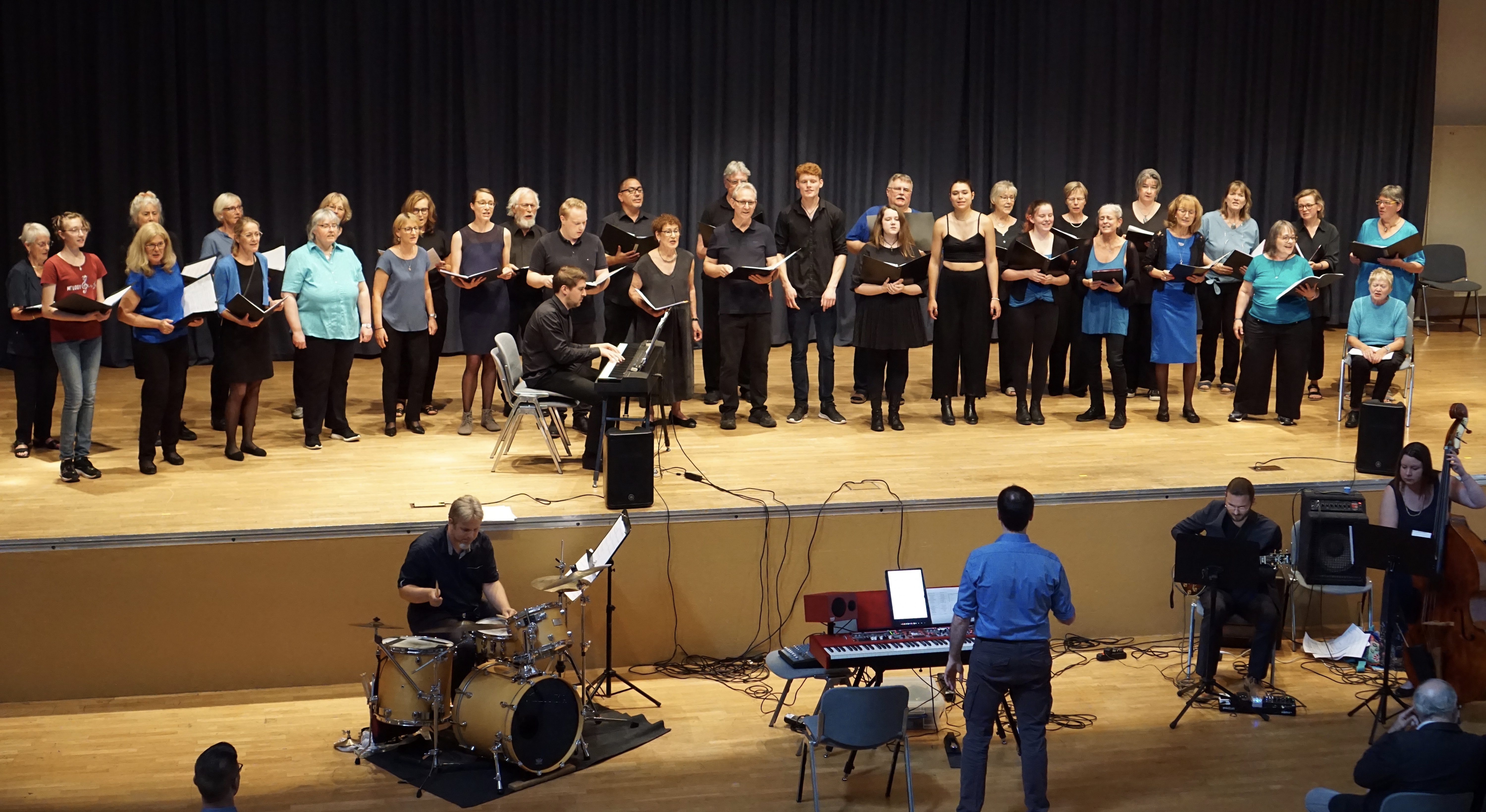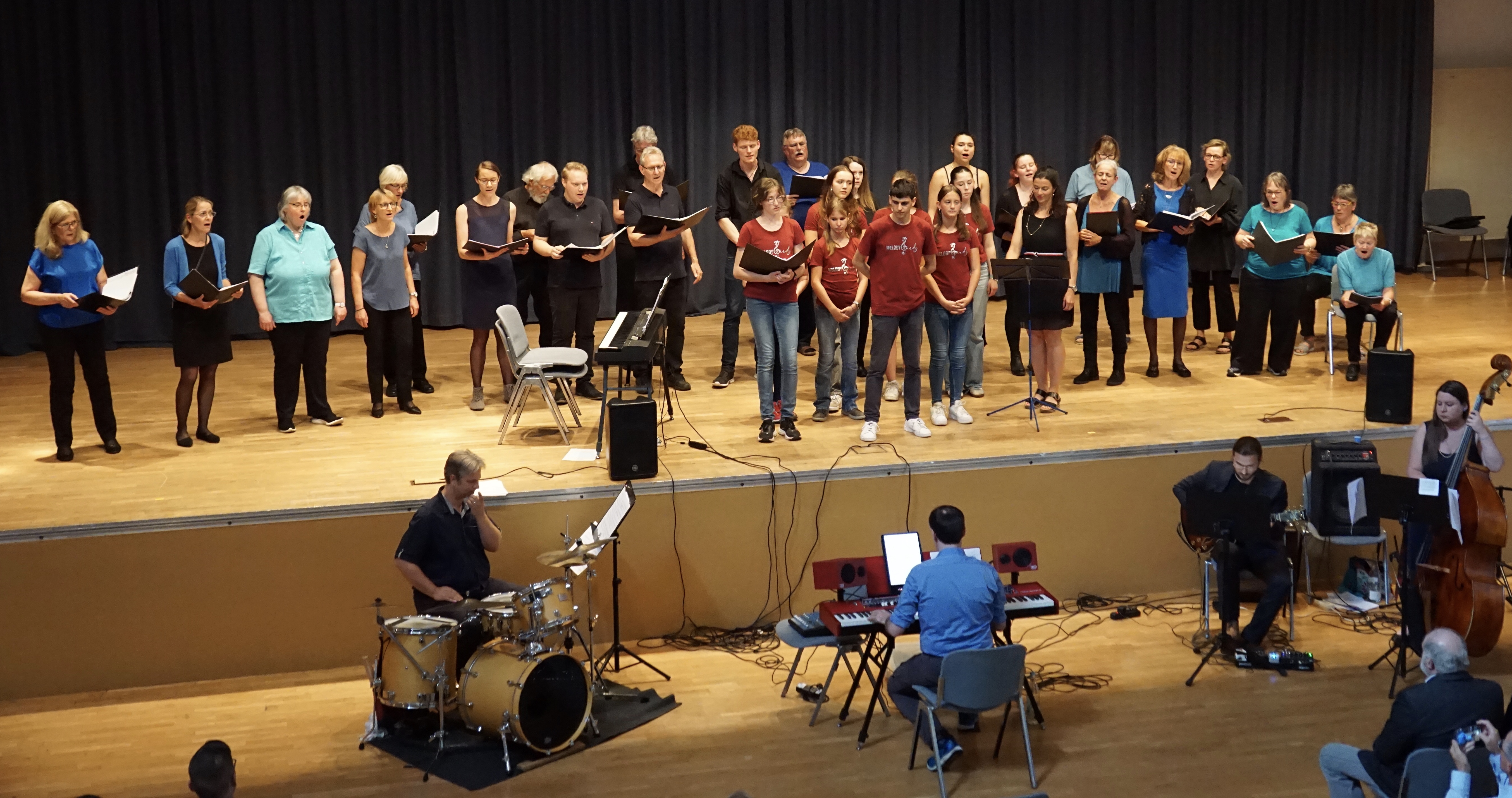 Alle zwanzig Lieder, die in unterschiedlichen Formationen dargeboten wurden, besaßen einen ganz besonderen und einzigartigen Sound, denn sämtliche Stücke hatte der Jazzchorleiter Wolfgang Vetter, dem auch die musikalische Gesamtleitung unterlag, arrangiert. Zusammen mit Christine Pyszak, der engagierten Leiterin des Kinder- und Jugendchors, waren die gemeinsamen Stücke der drei Chöre einstudiert worden. Wolfgang Vetter moderierte beim Konzert nicht nur amüsant und kenntnisreich durch die Welt der Filmmusik, sondern überzeugte ebenso als ausgebildeter Operntenor in seinen beiden schönen Soli „By Strauss“ und „Mister Cellophane“. Hervorzuheben ist auch die von Wolfgang Vetter zusammengestellte Band, die aus Ina Burger (Kontrabass), Benedikt Fox (Klavier), Benjamin Kolloch (Gitarre) und Thiemo Klaas (Schlagzeug) bestand. Die Musiker unterstützten souverän, flexibel und mit großer musikalischer Qualität den Chorgesang und brillierten auch in einigen Soloeinlagen.