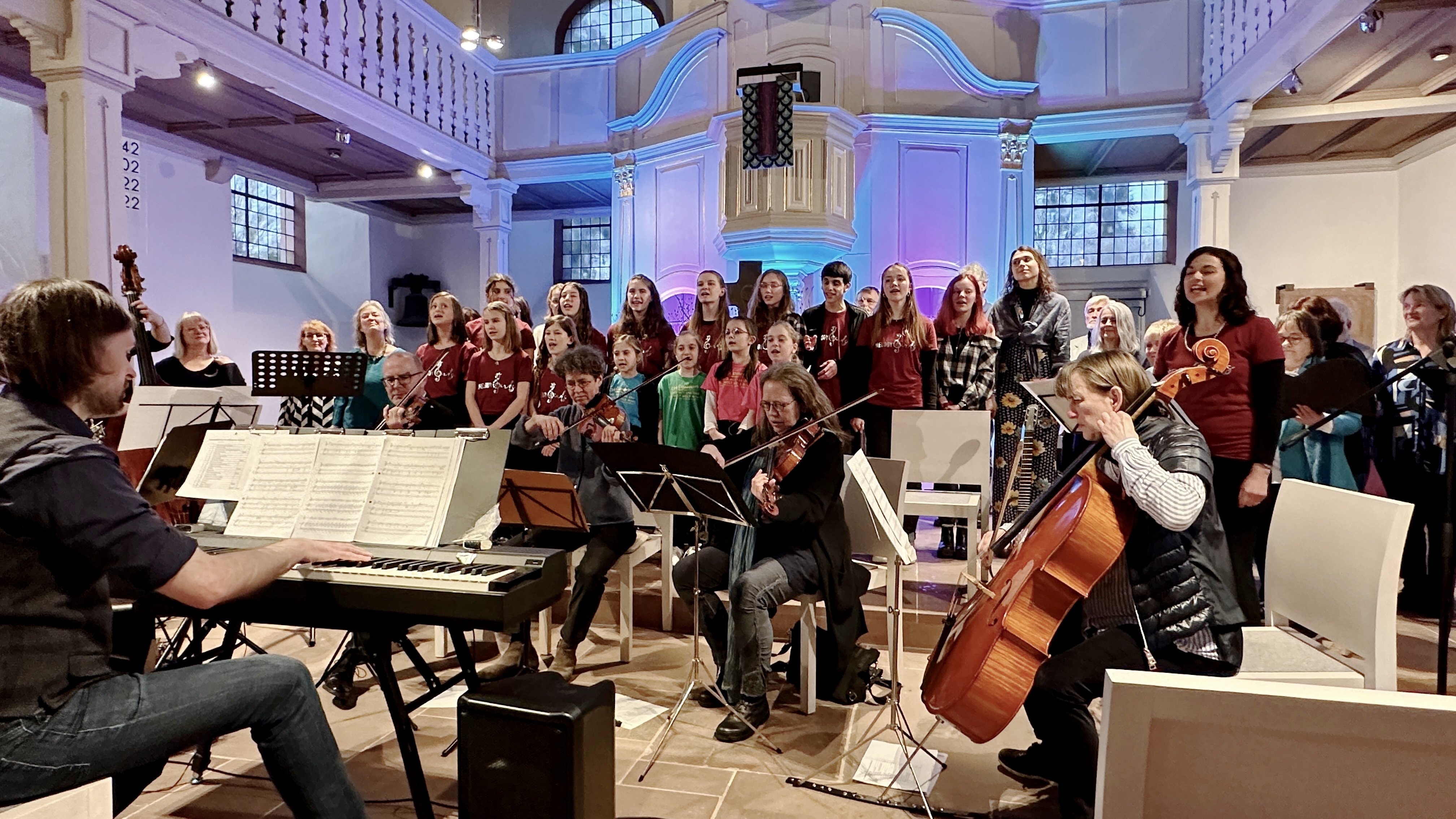 Erstmalig traten alle Abteilungen des Chor ´56, die „CHORmeten“ (Kinderchor), die in der Coronazeit neugegründeten „Melody Birds“ (Jugendchor), beide unter der engagierten Leitung von Christine Pyszak, und der Jazzchor gemeinsam auf und brachten zusammen die Arrangements zum Klingen. Die meisten Songs dieses Konzerts wurden von Wolfgang Vetter sehr wirkungsvoll für diesen Zweck arrangiert. Die gemeinsamen Auftritte der drei Chöre bildeten klanglich und emotional die Höhepunkte des Konzerts, besonders als die „Eiskönigin“ (Walt Disney) und als Zugabe „Will You Be There“ (Michael Jackson) erklangen. Der Kinder- und der Jugendchor sorgte mit seinen schönen Stimmen und sehr guter Intonation für eine anrührende Stimmung und neben Kinderliedern („Ich lieb den Frühling“) wurden auch Popsongs („When September Ends“ und „Shallow“) zum Besten gegeben.